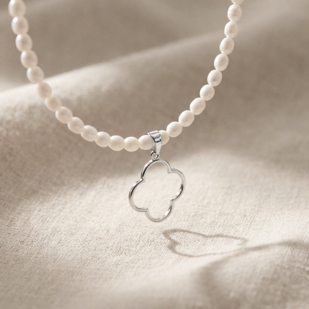 Unsere neue Perlenkette COLUMBIANA mit Süsswasserperlen und dem kleeblattförmigen Anhänger ist ganz nach Ihrer Persönlichkeit auch mit diversen Mainpunkt Ketten individuell kombinierbar.