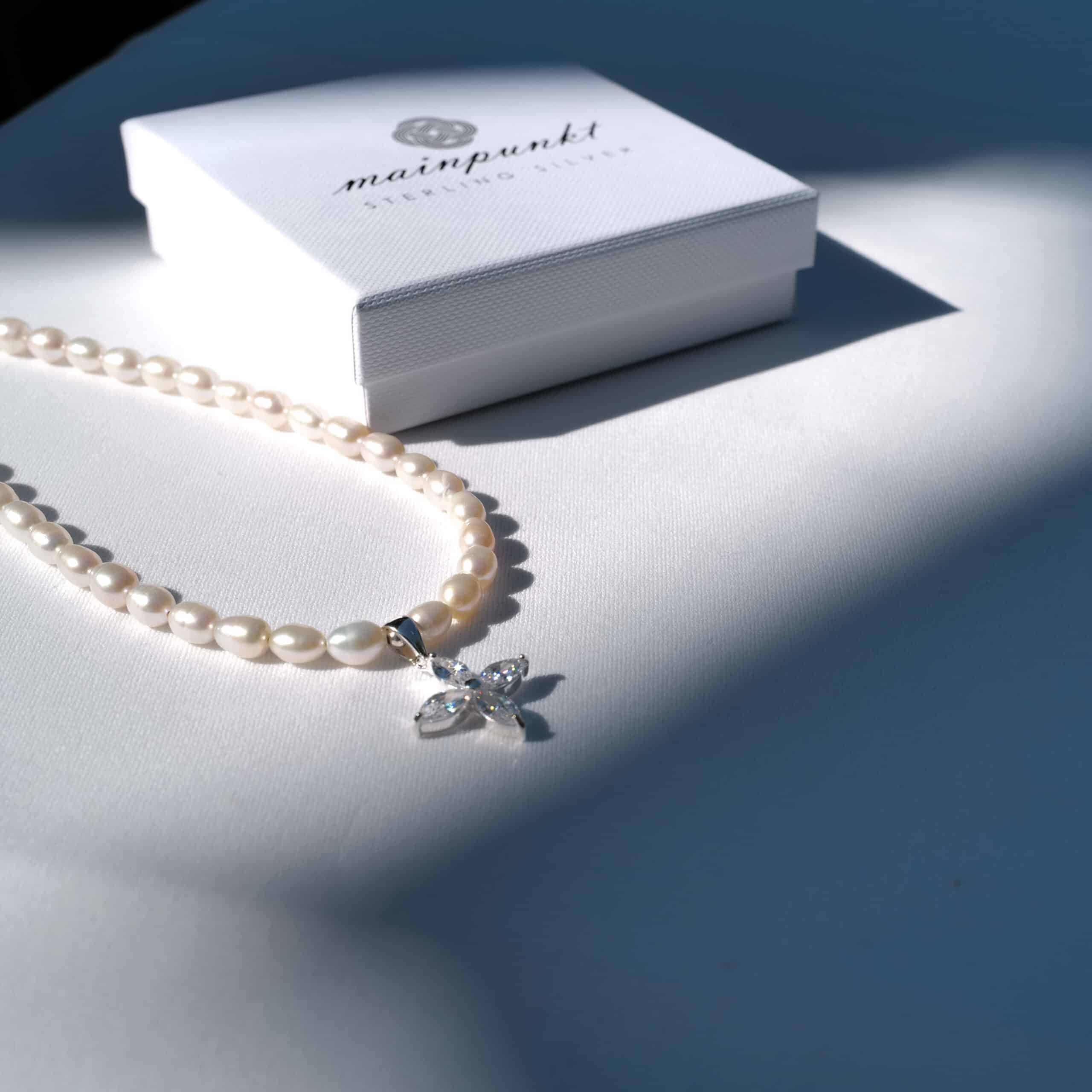 Handgefertigte feine Süsswasserperlenkette verziert mit 925’er Sterling Silber Elementen.