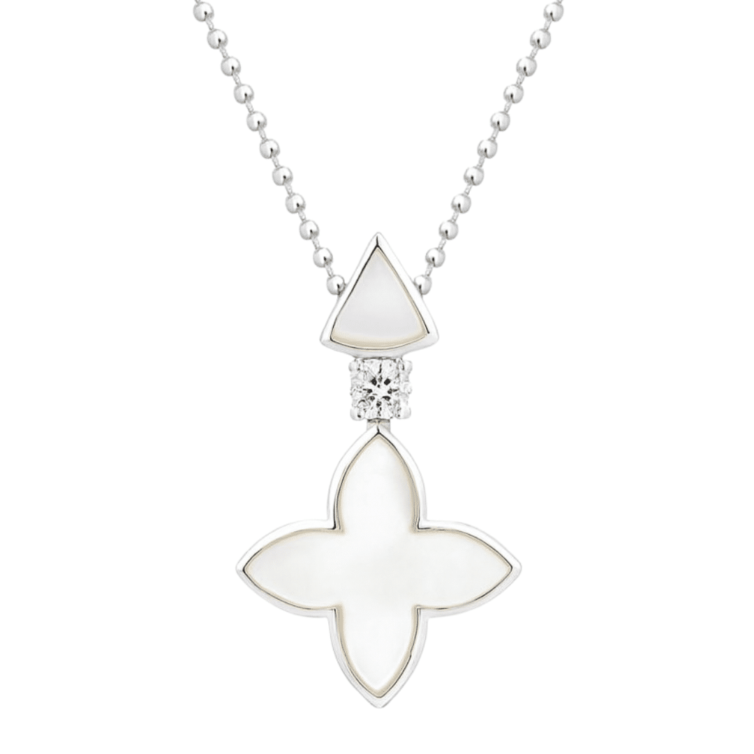 Die neueste Kette der Coslada Kollektion vereint außergewöhnliches Design mit edlen Materialien. Ein kunstvoll gearbeitetes Dreieck-Element, verziert mit schimmerndem Perlmutt und einem funkelnden Zirkoniastein, trifft auf unsere ikonische Coslada Blüte – ein Symbol für zeitlose Schönheit.