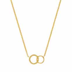 Diese Sterling-Silber-Kette mit Goldplattierung und mit zwei ineinander verschlungenen Kreisen vereint Stil und Bedeutung. Die Kreise symbolisieren Unendlichkeit und Verbundenheit. Ein zeitloses Schmuckstück, das durch seine Eleganz sowohl im Alltag als auch bei besonderen Anlässen besticht.