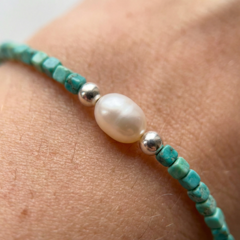 Steine: Türkis, ca. 3mm und Süsswasserperle, ca. 4mm