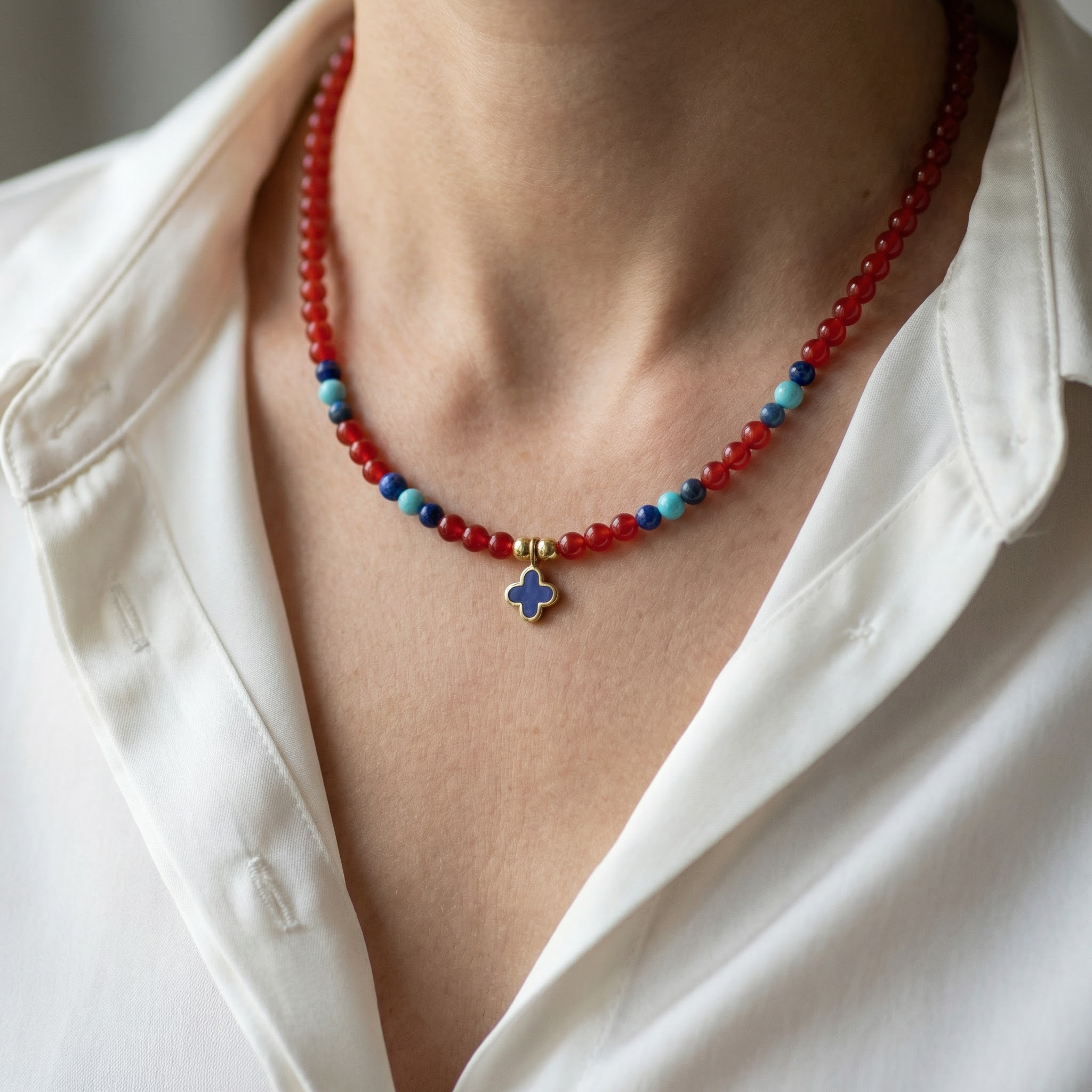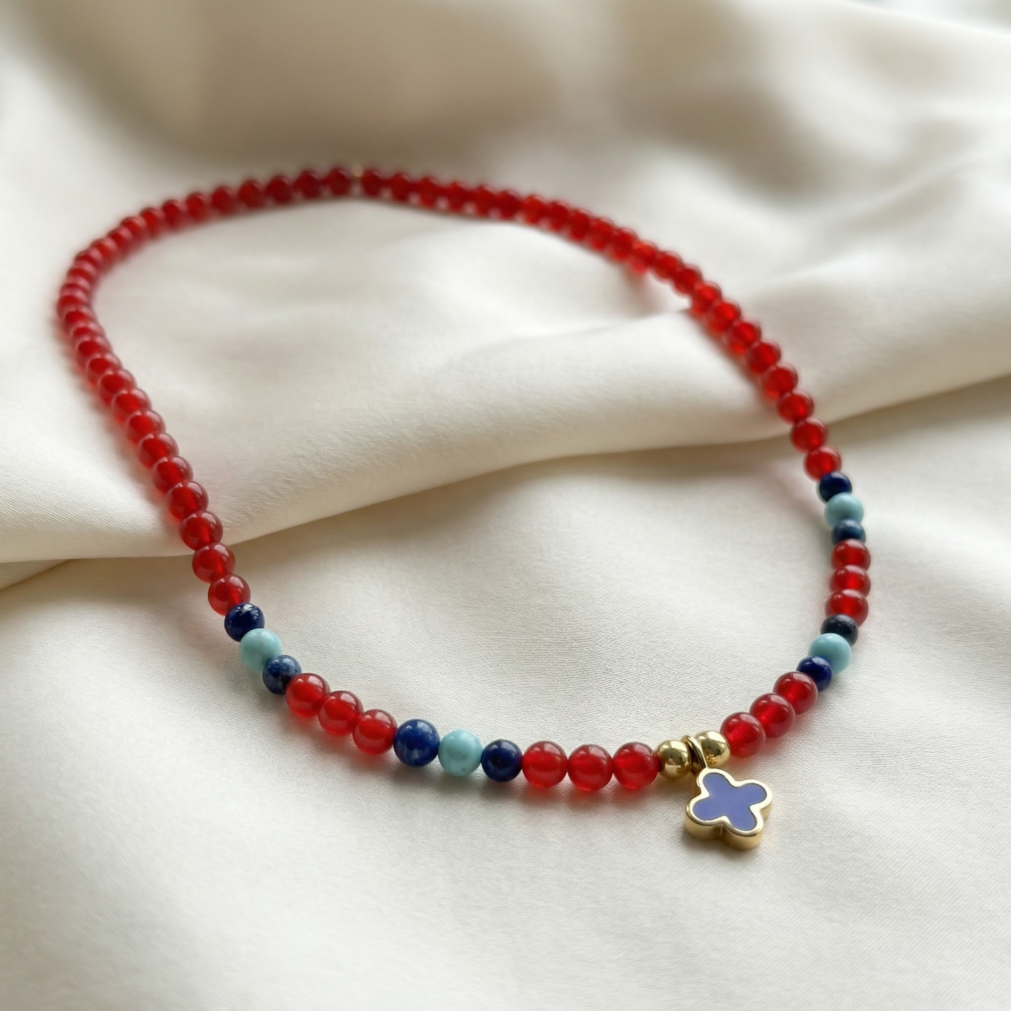 Die NORI Kette vereint feine Handwerkskunst mit einzigartigem Design: Hochwertige Edelsteinkugeln – Lapis, Türkis, roter Onyx – treffen auf unseren charakteristischen kleeblattförmigen Anhänger New York Mini Lapis aus 925er Sterling Silber goldplattiert.