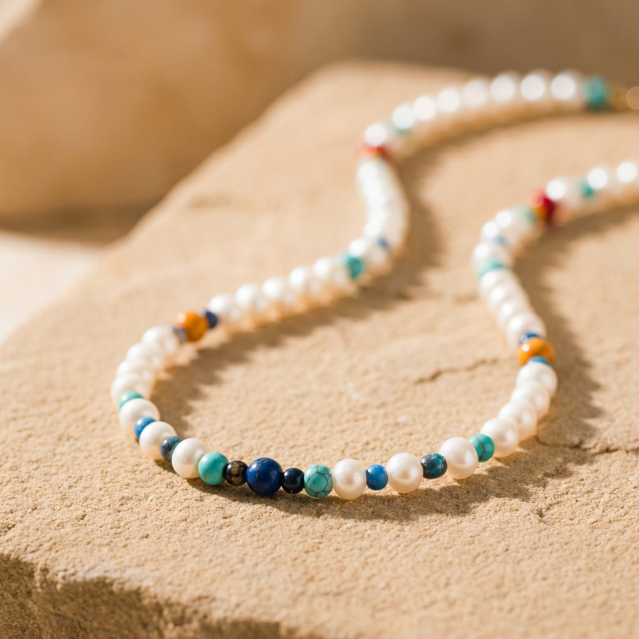 Steine: Süsswasserperlen, Türkis (facettiert), Türkis, Karneol, roter Onyx, Lapis, schwarz Onyx (facettiert), gelbe Perlmutt