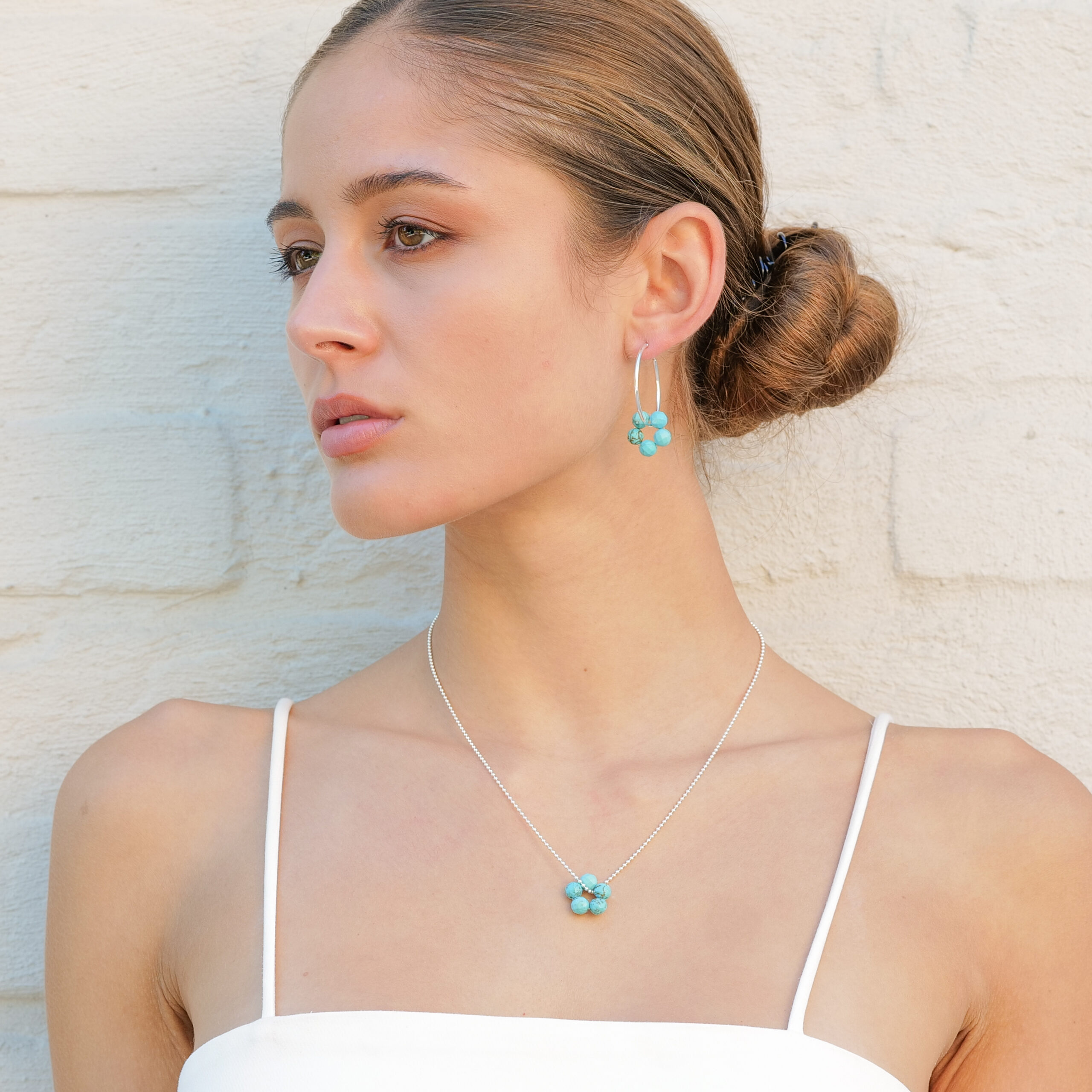 Handgefertigte blumige Edelstein-Flower Anhänger angebracht an einer 925’er Sterling Silber Creolen.
