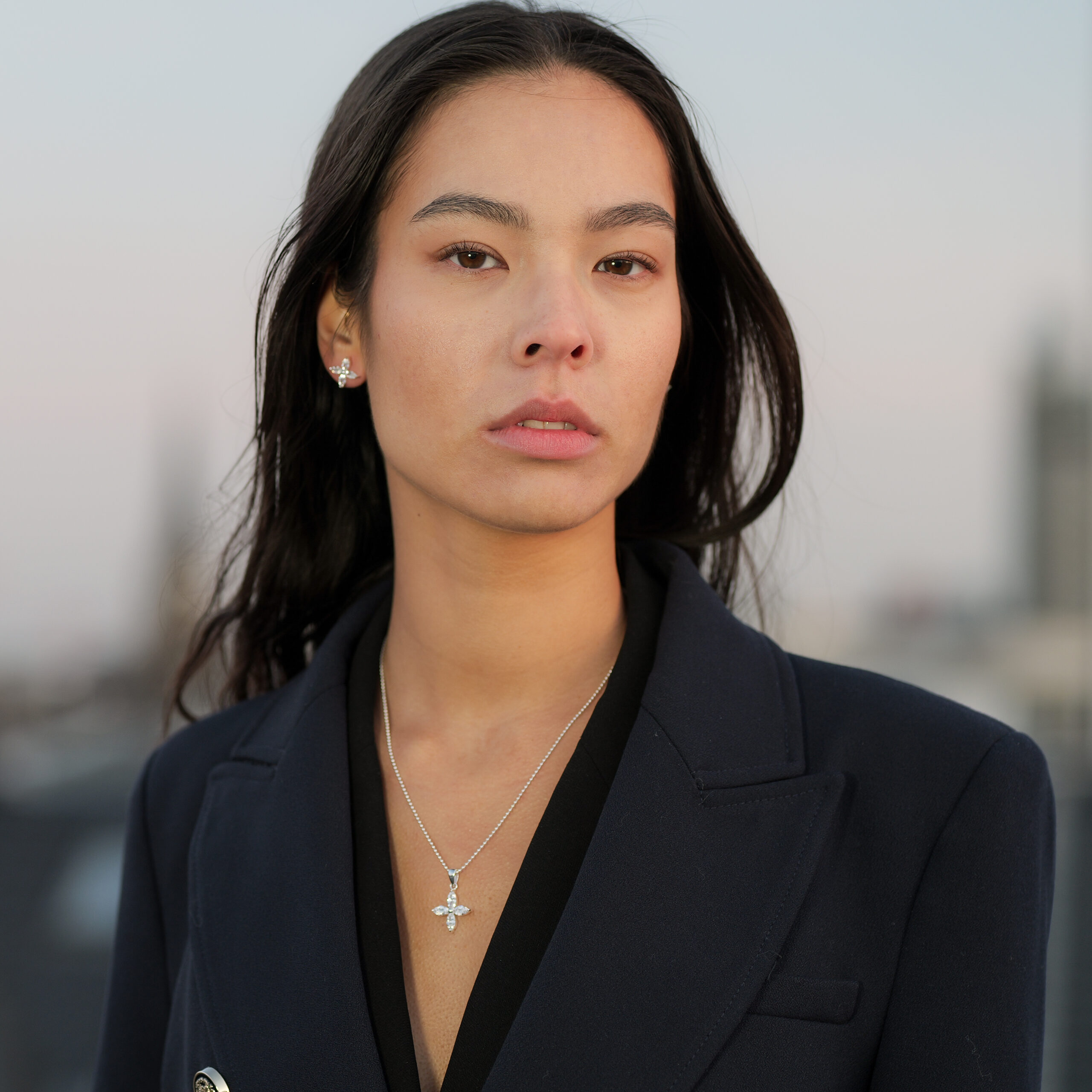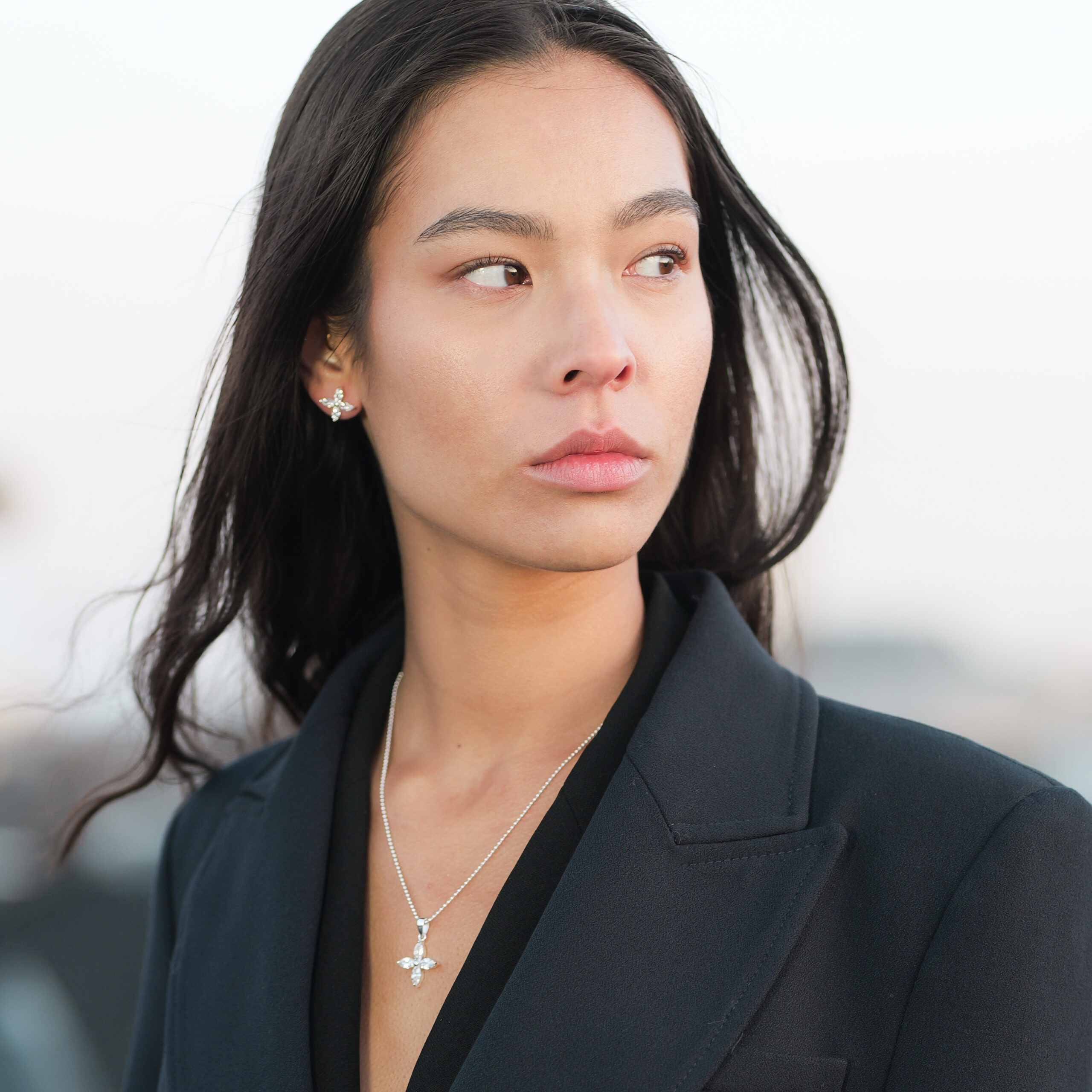 Die funkelnden ELENI Stecker sind mit 4 Zirkoniasteinen besetzt und sorgen für einen eleganten und zeitlosen Look in Sterling Silber. Die handgefertigten kleeblattförmigen Ohrringe sind in Silber und goldplattiert erhältlich und die Stecker haben eine Größe von ca. 1,4cm.