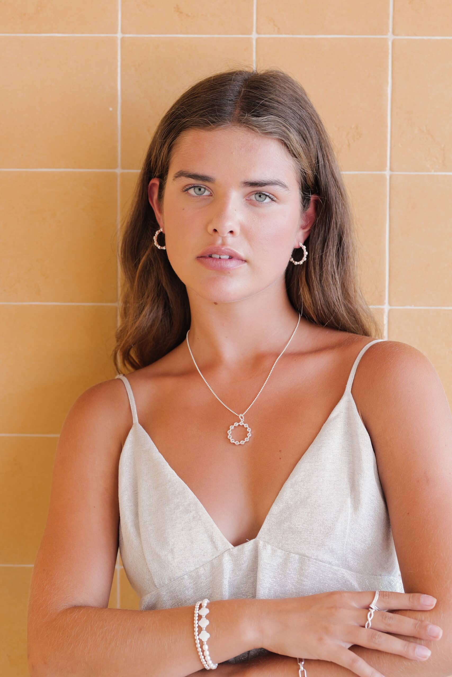 Die funkelnden Creolen sind mit mehreren zierlichen Zirkoniasteinen besetzt und sorgen für einen eleganten und zeitlosen Schmuck-Look in Sterling Silber. Die handgefertigten Ohrringe sind die perfekte Ergänzung zu unserer neuen NALLELI Kollektion.
