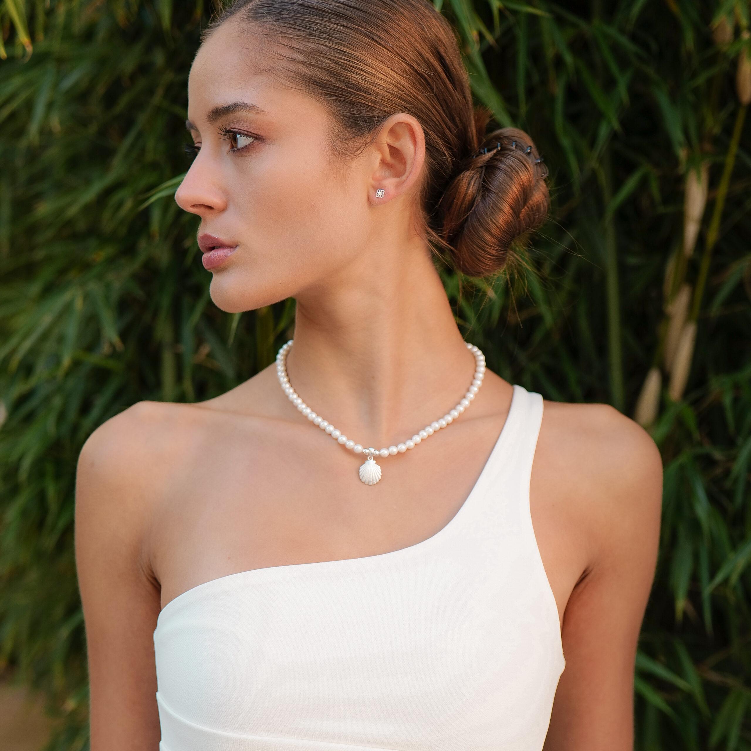Underwater Love: Das filigrane Muschel-Perlencollier „Guscio“ besticht mit seiner filigraner Verarbeitung. Die Muschel ist fein aus 925er Sterlingsilber gearbeitet. Ein Must-have für verspielte Sommerlooks.