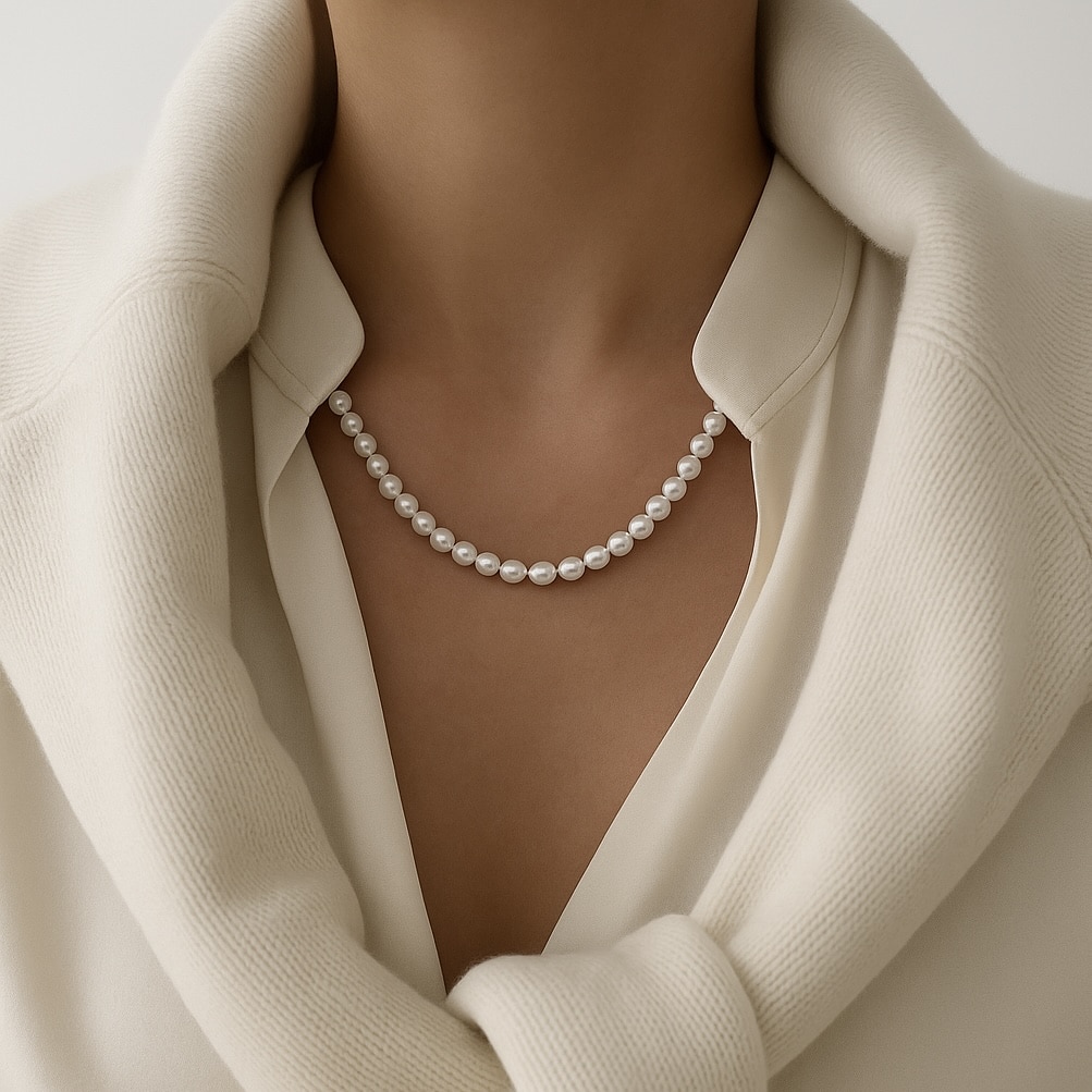 Diese Halskette mit wunderschönen Süsswasserperlen wird in unserem Studio von Hand auf einen starken Metalldraht aufgezogen und verleiht all Ihren Looks eine einzigartige Note. Tragen Sie dieses umwerfende Stück solo oder im Lagenlook.