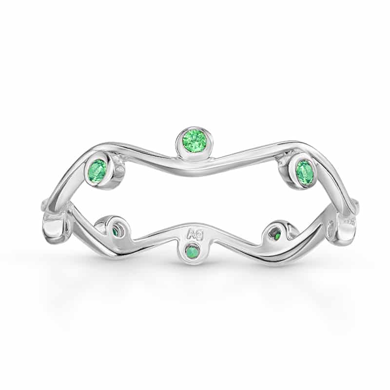 Der Ring ist aus hochwertigem 925er Sterlingsilber gestaltet und mit runden grünen Zirkonia-Steinen besetzt.